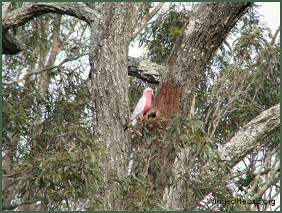The galahs in our yard had already shown us their nest earlier in the season and the new corellas too had called us for a house warming. After Vicky and the crows swapped their nests, we were trying to spot any crow chicks in their new dwelling, when another pair of galahs took the opportunity to show us their new dwelling.