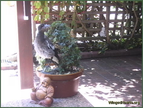 As Junior gets older, I guess the older maggies will drive him away and he will have to find his own territory and, hopefully, a mate. We will miss him but think that we will be able to recognise him as an adult from the black spot behind his head.